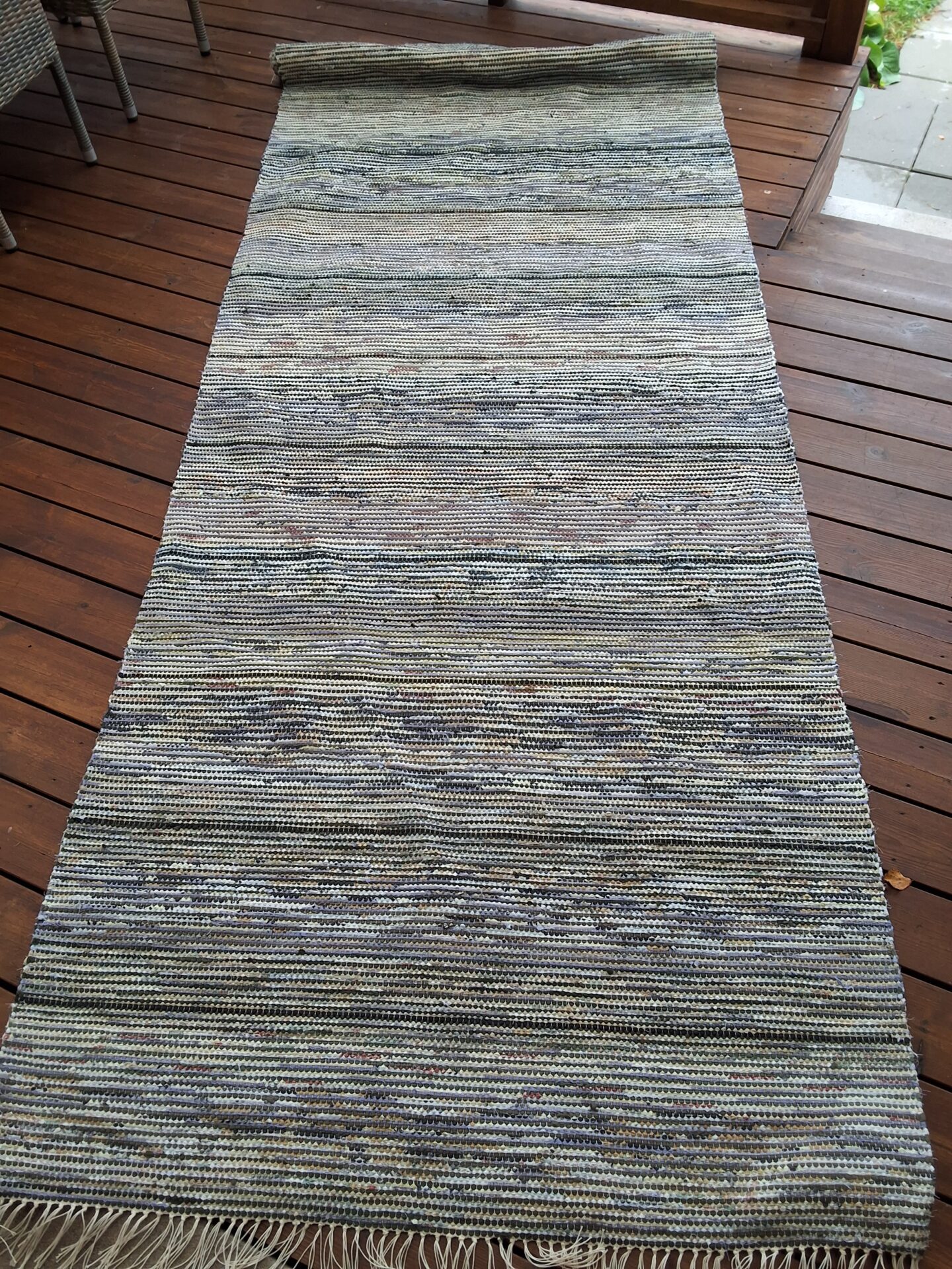 KISSANKELLO-matossa on tummanvihreä collegehousu koko ajan, hillitty ja murrettu kirjava lakana toisena, kolmantena kissankellon värinen kirjava lakana ,joka keskellä on voimakkaampi kuin lähellä mustaa raitaa on kudottu vaaleaan loimeen..