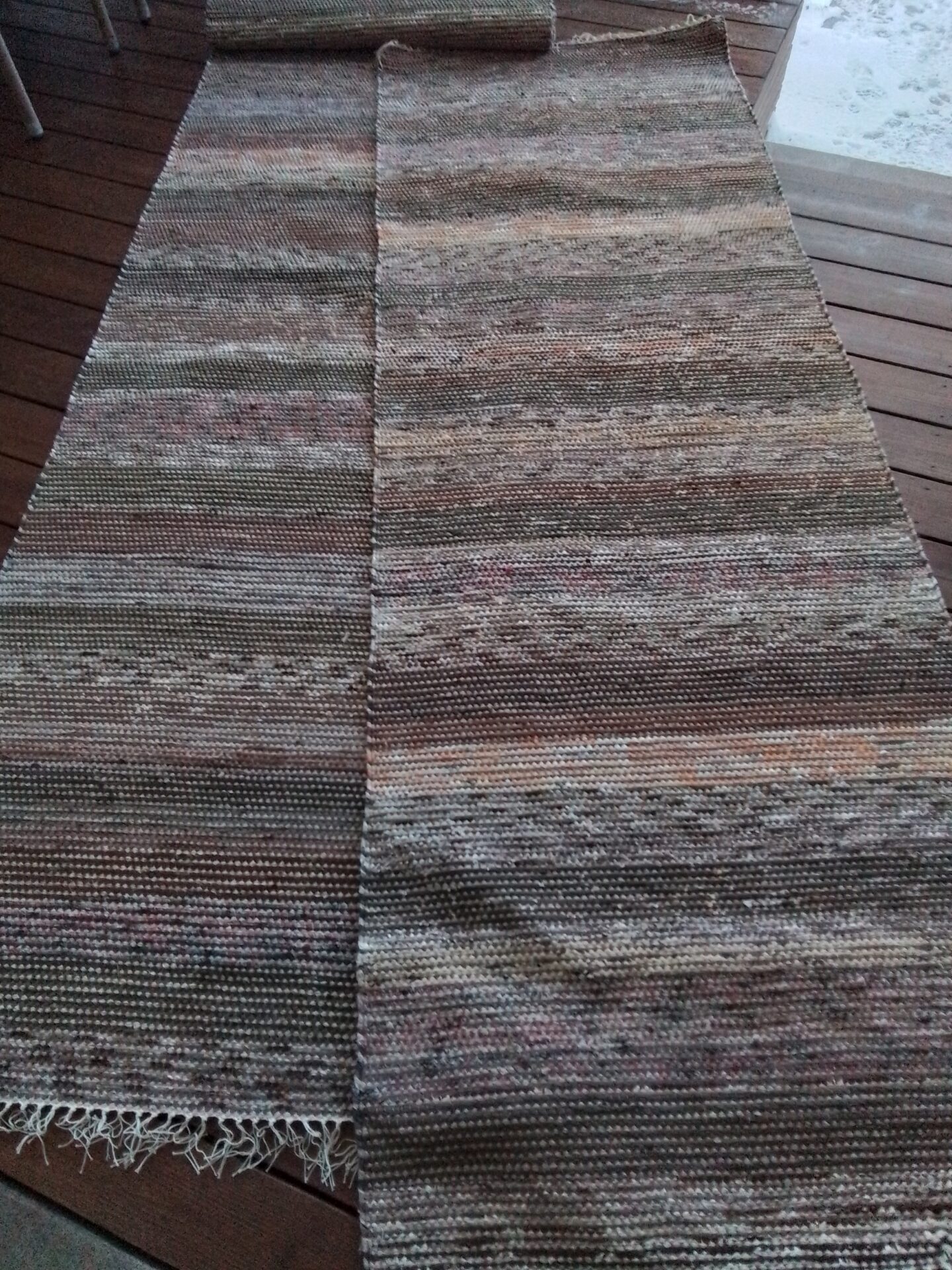 Tässä matossa beige- lakanakude kulkee koko ajan. Lisäksi ruskea trikoopaita-housukude kulkee koko ajan. Kolmantena kuteena flanellipaita tai kirjava ruskea kude. 20 sentin välein kirjava ruskea muuttuu 7 heiton sammaleenvihreäksi collegehousuksi. Tähän mattoon ei laitettu viiruja vaan liukuvärein kudottu.