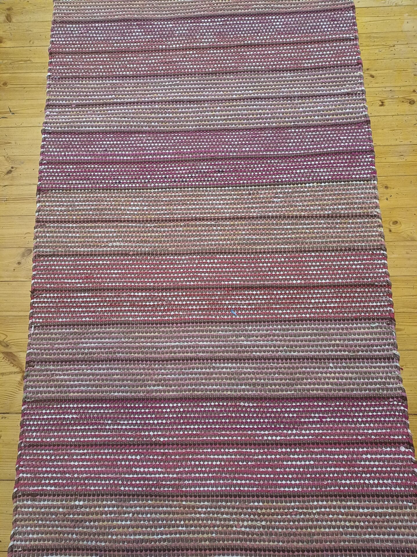Hillityn roosanpunaista ja vadelmanväristä kudetta, ruskea kude kulkee koko ajan ja kellertävä kirjava lakana. Tätä olen kutonut myös harmaakuteisena. Raidat n 15 sentin välein. Harmaakuteeseen olen kutonut mustaan loimeen.