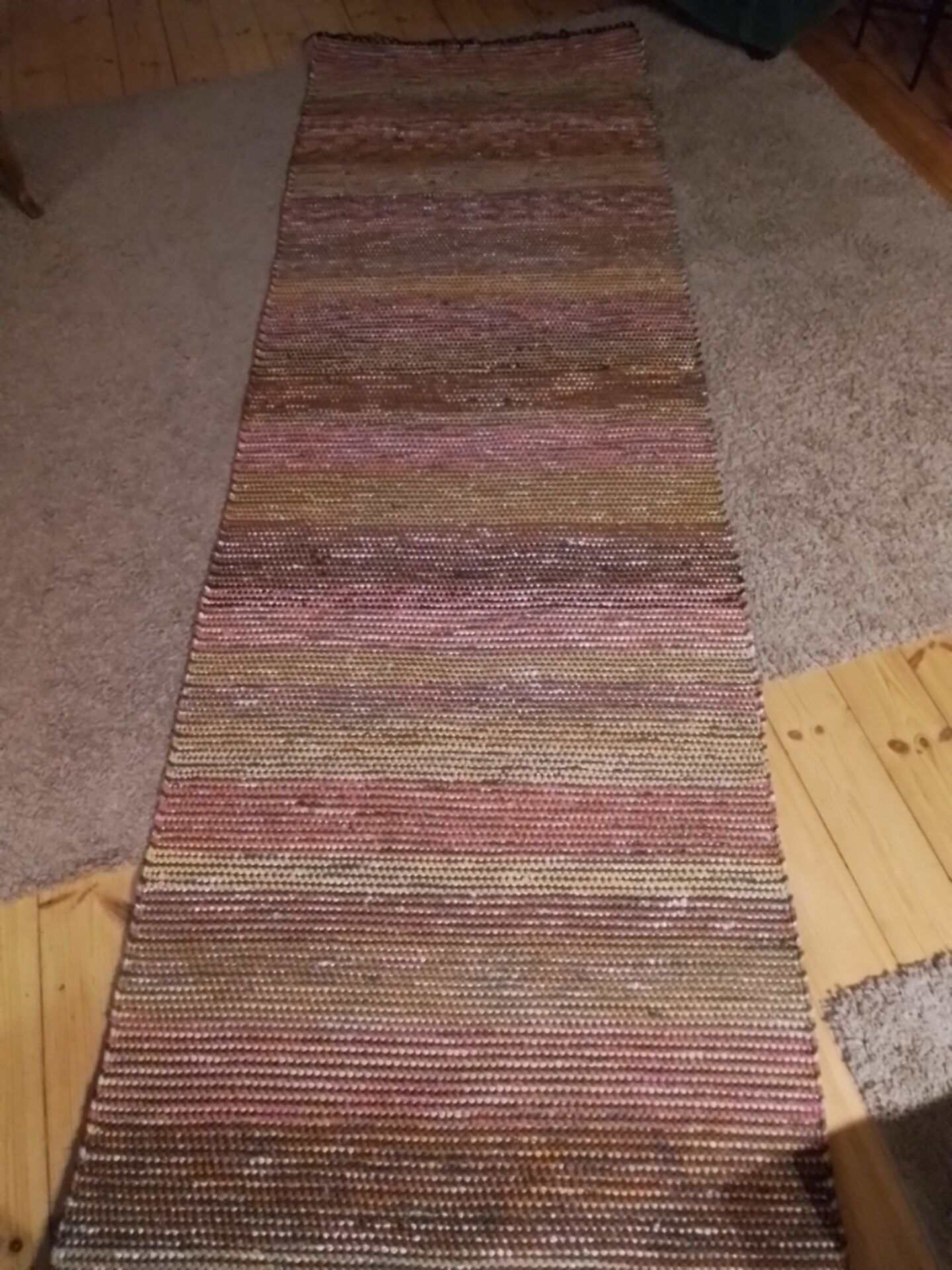 Tässä matossa syksyn kaikki värit. Koko ajan kulkee tummanruskea/ harmaa collegehousu, toisena kuteena on kirjava, värikäs lakana ja kolmantena kellertävä, sinapinvärinen, oranssi trikoo kude.. noin 15 sentin välein syksyn ruskavärit vaihtuvat persikanväriseen kuteeseen.